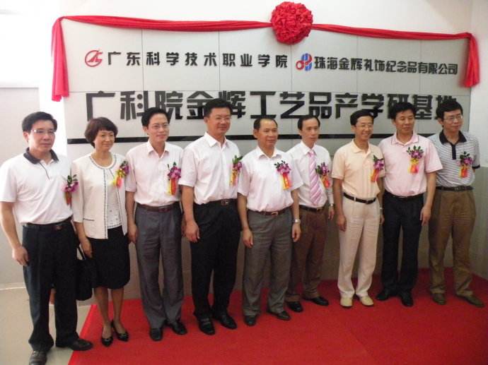 2009年底,广科院和珠海市金辉礼饰纪念品有限公司合作成立“教学企业”——广科院金辉工艺品产学研基地。该基地由校企共同投资,总投资近400万元,占地面积近2000平方米,产品展示厅、设计工作室、生产车间、销售部等一应俱全。